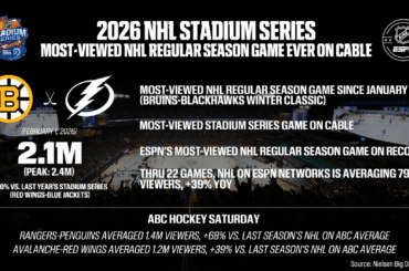 Numéros d’audience de la série des stades de la LNH 2026 et du samedi d’ABC Hockey. Un pic à 2,4…