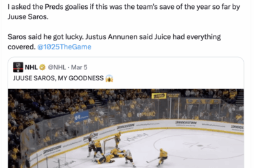 [Herz] J’ai demandé aux gardiens des Preds si c’était l’arrêt de l’équipe de l’année jusqu’à présent par Juuse Saros. Saros…