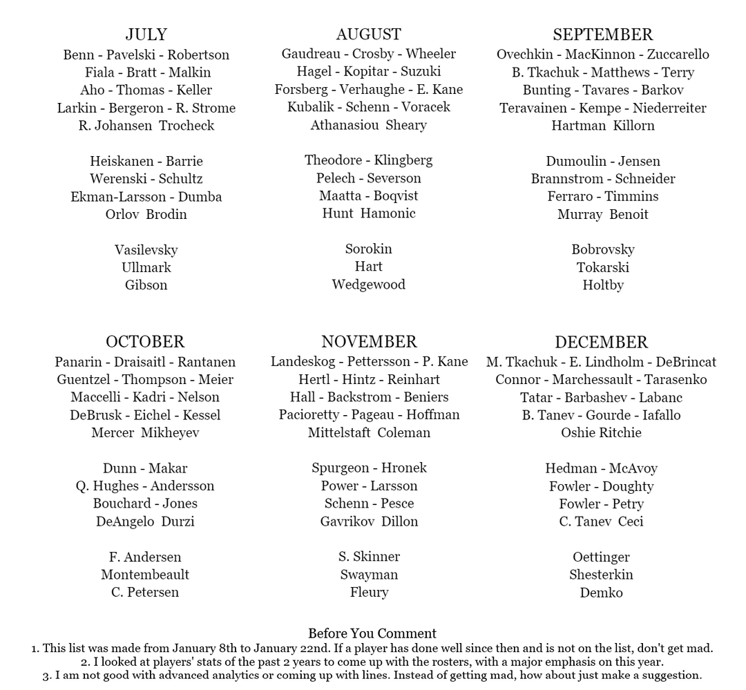 I’m going with July. Great forwards, amazing goalies. Defense is a bit of a weakness but Heiskanen, Dumba and Brodin are excellent. I can make that work.