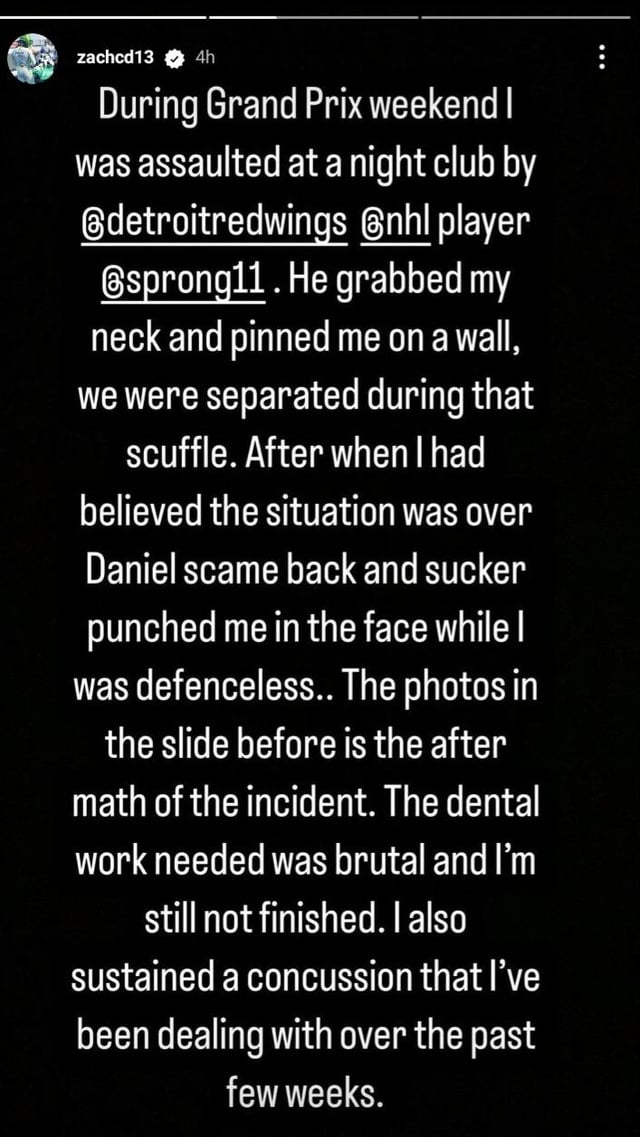 Le pilote automobile canadien Zach Claman DeMelo affirme avoir été agressé par le joueur des Red Wings Daniel Sprong dans une publication sur Instagram.