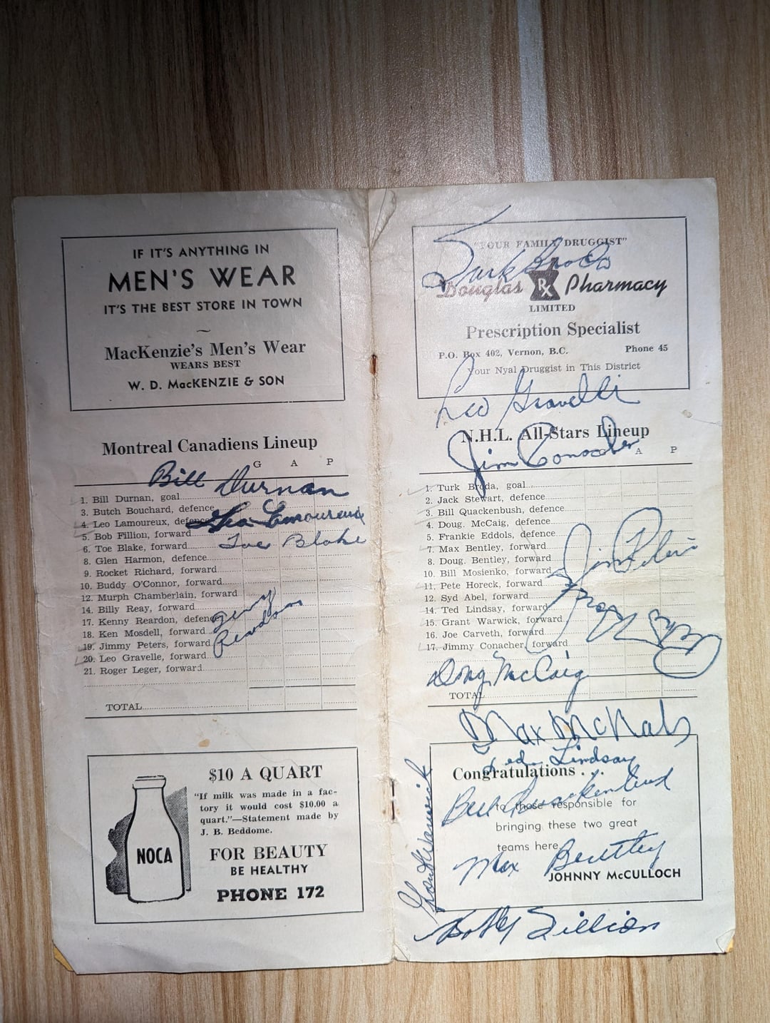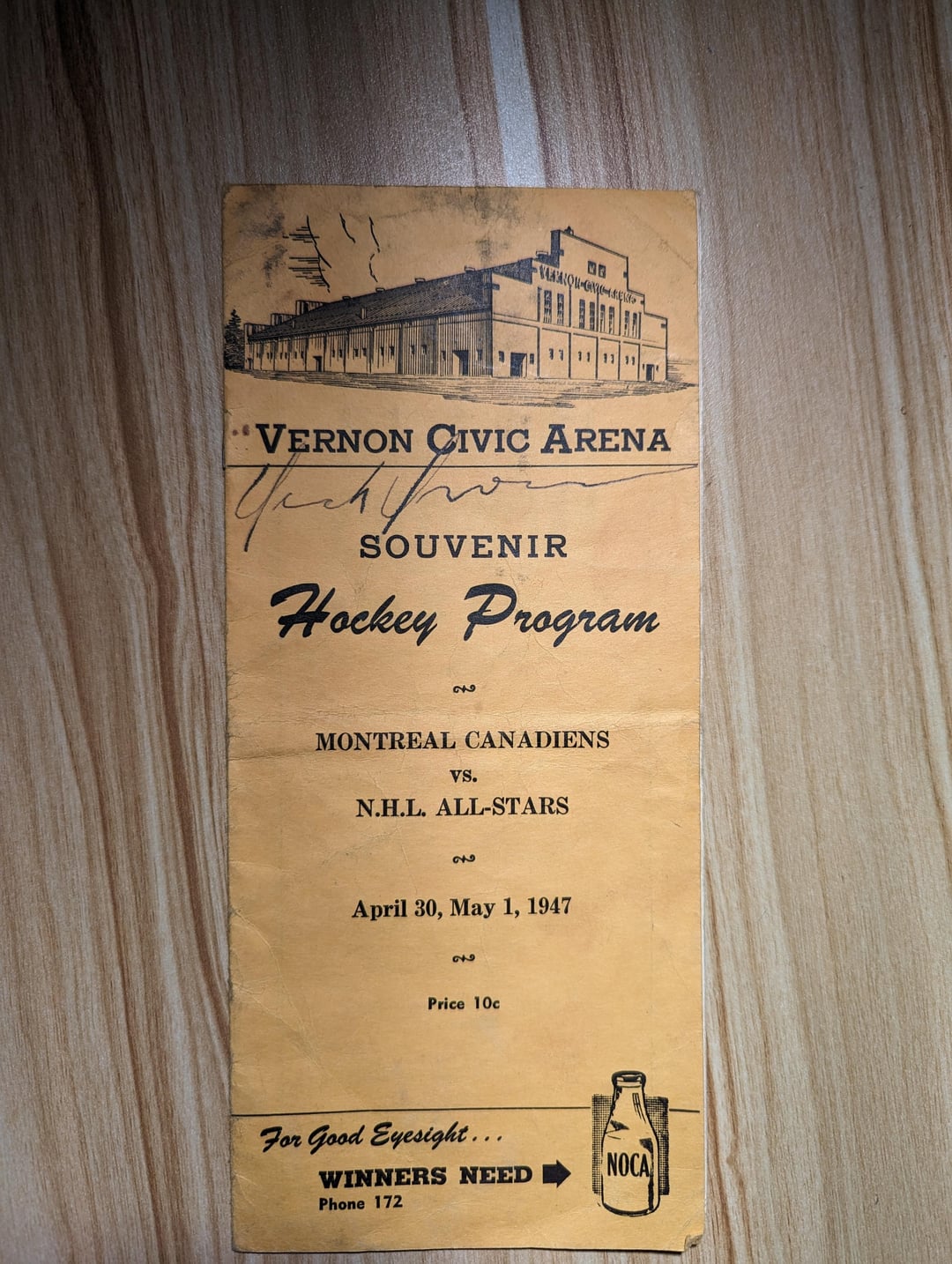 J’ai récemment reçu ce programme dédicacé du Match des étoiles de la LNH de 1947 de ma défunte grand-mère, qui vivait à Vernon, en Colombie-Britannique, à l’époque. Je suis un peu confus – il semble que le premier match officiel des étoiles de la LNH n’a eu lieu qu’en 47-48 et a été joué à Toronto (avec les Leafs contre les All Stars). Je ne trouve rien sur ce jeu, ni pourquoi ils joueraient à Vernon. Faisaient-ils une tournée à travers le pays ? Autographes inclus : Dick Irvin (Sr.) Bill Durnan Leo Lamoureux Toe Blake Kenny Reardon Turk Broda Leo Gravelle Jimmy Conacher Jimmy Peters Pete Horeck Doug McCaig Max McNab Ted Lindsay Bill Quackenbush Max Bentley Grant Warwick Bob Fillion Malheureusement, pas de Maurice Richard, ce qui a probablement contrarié ma grand-mère sans fin. Quelqu’un a des infos sur ce jeu ?