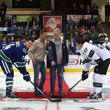 Larry a laissé tomber la rondelle de cérémonie à #KraftHockeyville. Sur la photo, Adam Cracknell, joueur de #Canucks et garçon local, et Tommy Wingels, joueur de #SJSharks.