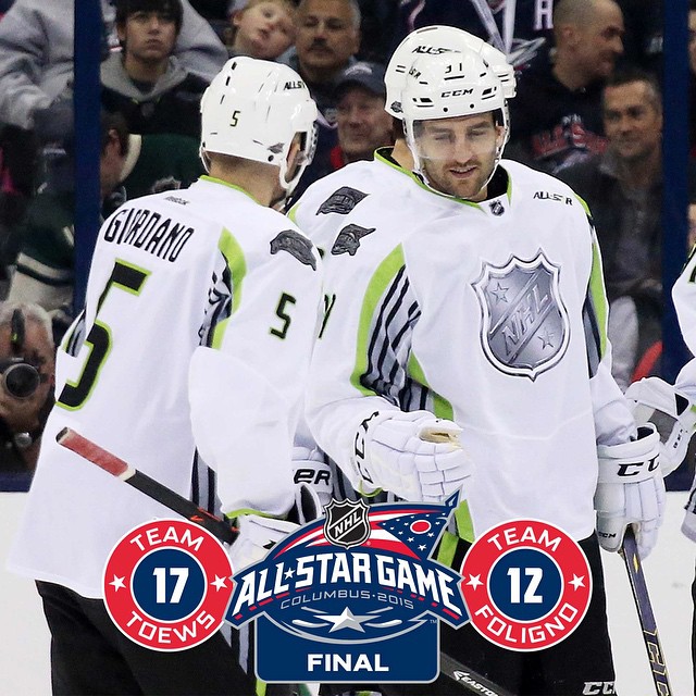 C'est tous les gens. #TeamToews remporte le jeu #NHLAllStar 2015 en battant #TeamFoligno 17-12. Le plus grand nombre de buts dans un match des étoiles.