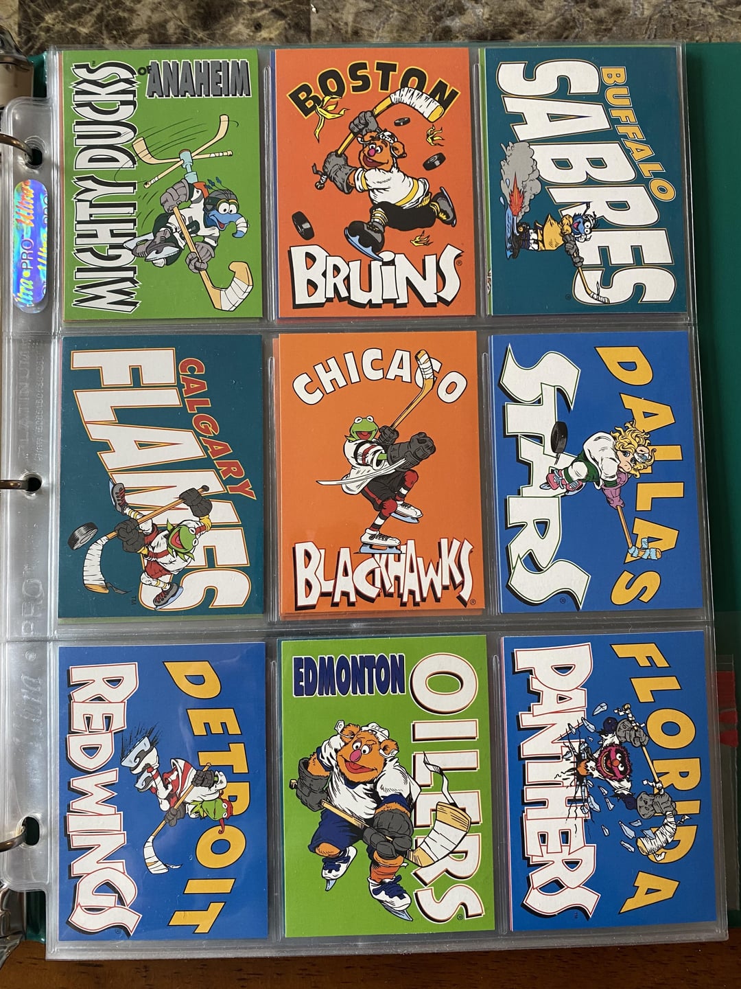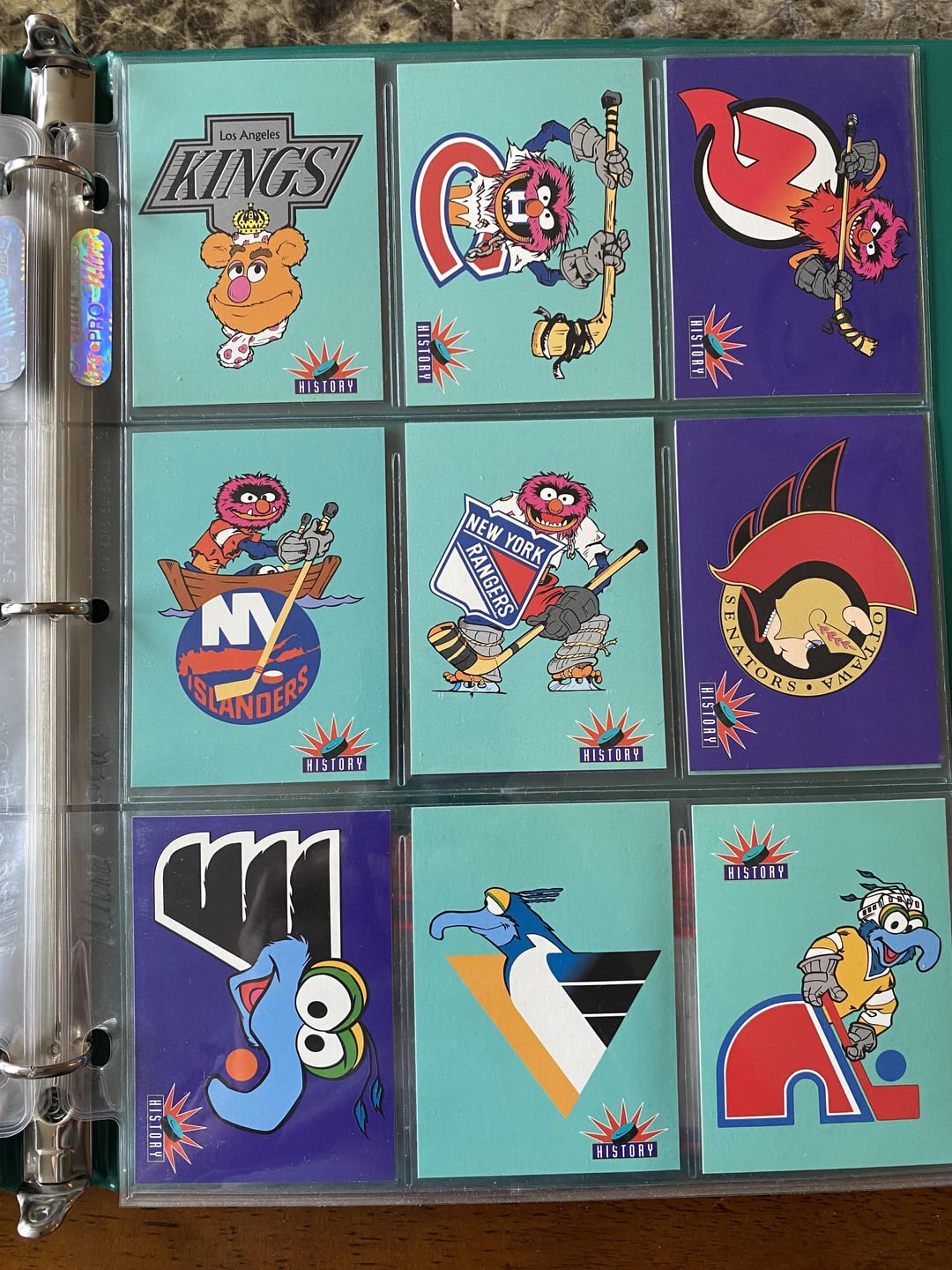 Hier soir, lors de la fête de Noël de notre groupe d’amis, mon Père Noël secret m’a offert un jeu complet de ces cartes croisées LNH/Muppet de 1994. Je ne savais même pas qu’elles existaient ! Il y a des cartes sur les positions, l’équipement, les pénalités, le gameplay, les équipes et les logos des équipes, le tout avec d’excellentes informations au dos. Le meilleur cadeau de tous les temps !