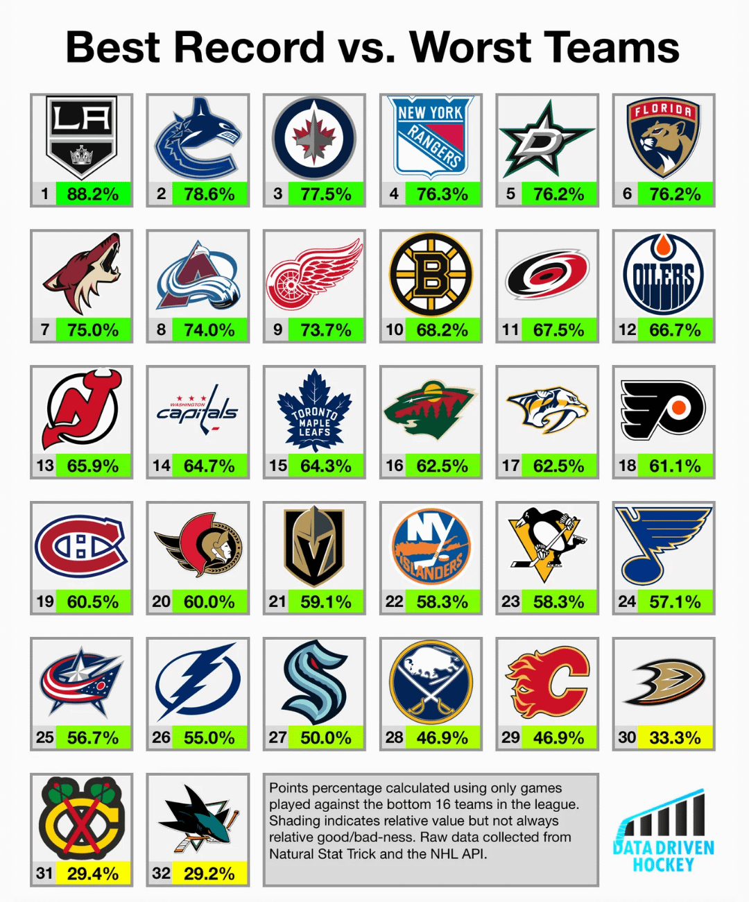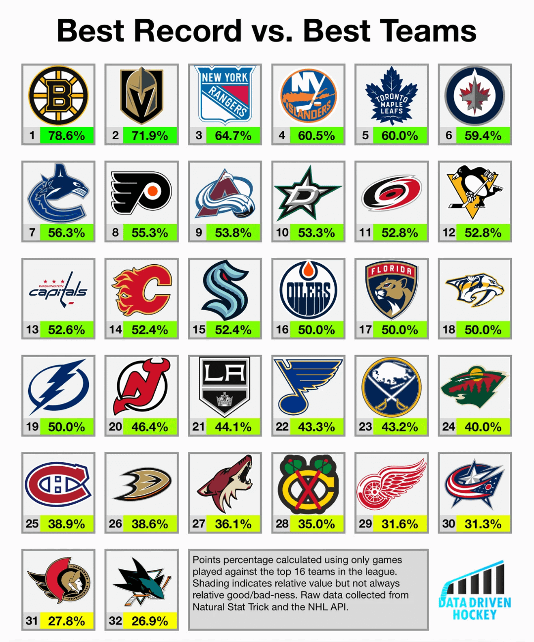 Bruins, Knights, Isles, Kraken, Ducks, and Hawks all somehow have better records against the top teams.