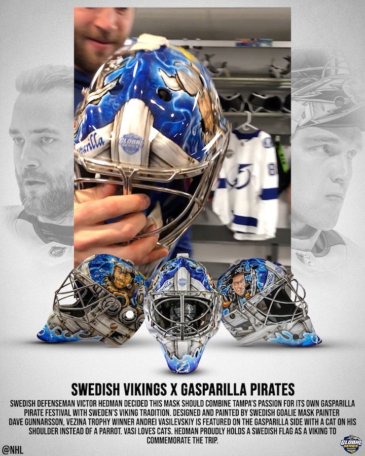 Le défenseur suédois Victor Hedman a eu l’idée d’un masque de gardien de but @blightning pour fêter le voyage de l’équipe dans sa Suède natale: le festival Gasparilla Pirate de Tampa rencontre les Vikings suédois. Ensuite, l'artiste de masques suédois @DaveArt s'est mis au travail et @ andreivasilevskiy88 est intervenu. #NHLGlobalSeries @nhleurope