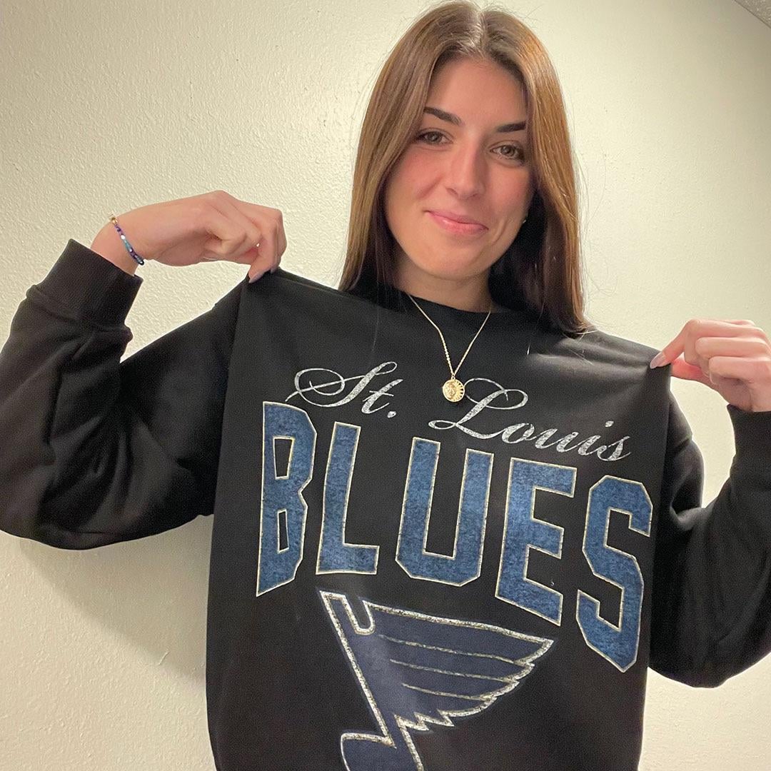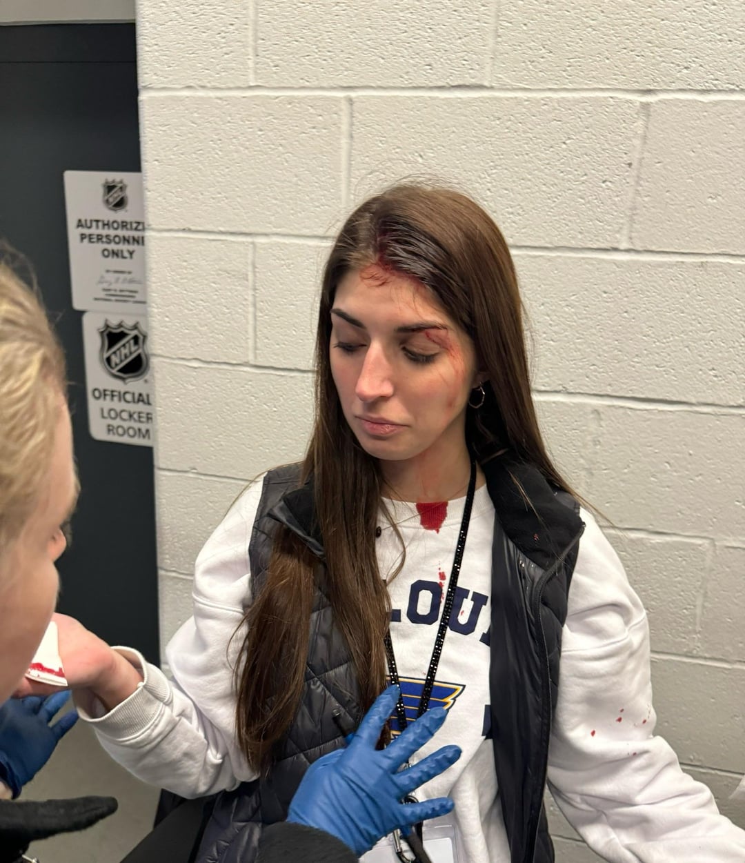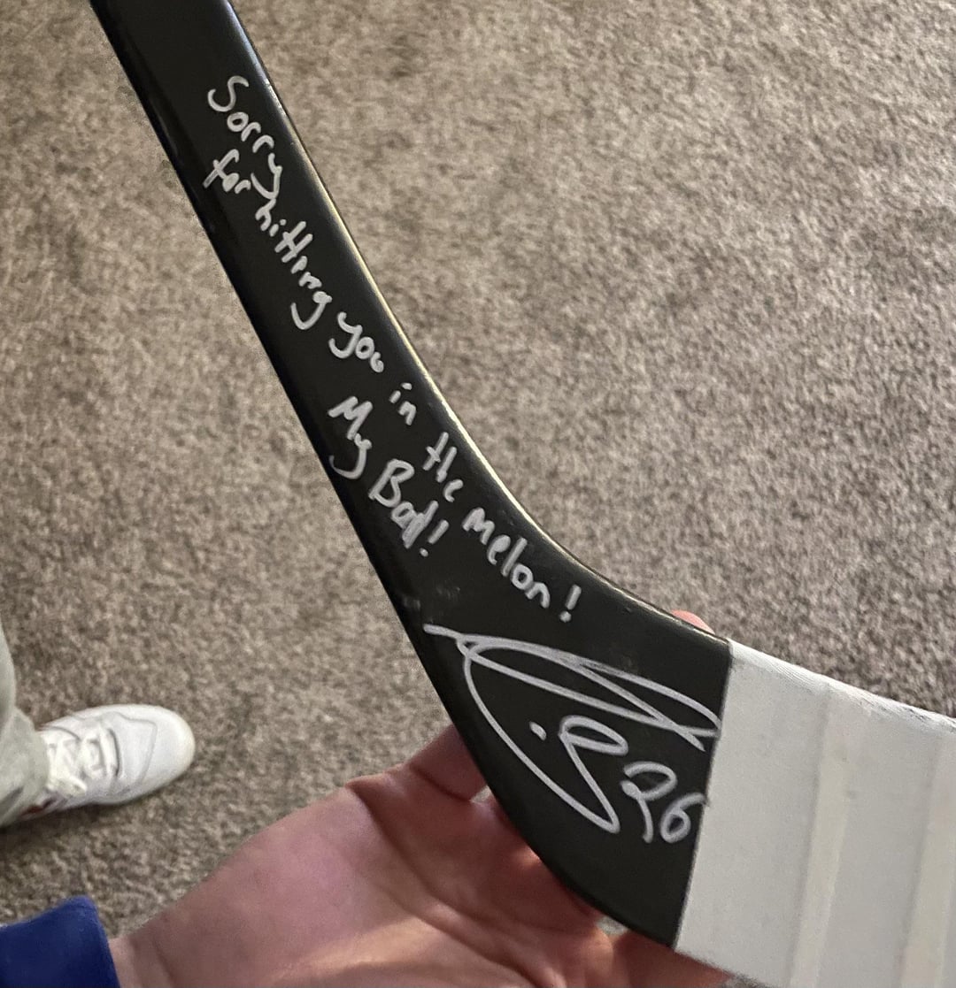 [St Louis Blues] Lorsque Nathan Walker a frappé la barre transversale lors de l’échauffement avant un récent match à domicile, la rondelle a traversé la vitre et a touché l’assistante photographique Lexie Knight. Heureusement, elle s’est complètement rétablie et a maintenant un bâton signé (et un pull sans sang) gracieuseté des Walkers.