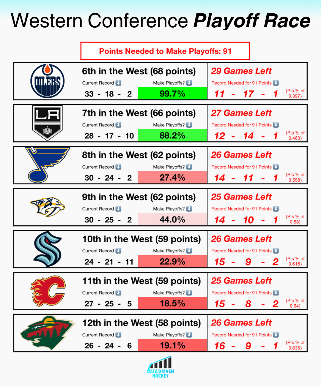 Was looking into the upcoming schedules for the Blues and Preds. They have a way easier schedule and are playing well. The Blues have a harder schedule and are still bipolar. It’s hard to see us staying above the Preds, but the Blues are weird. We could equally lose all our remaining games or win them.