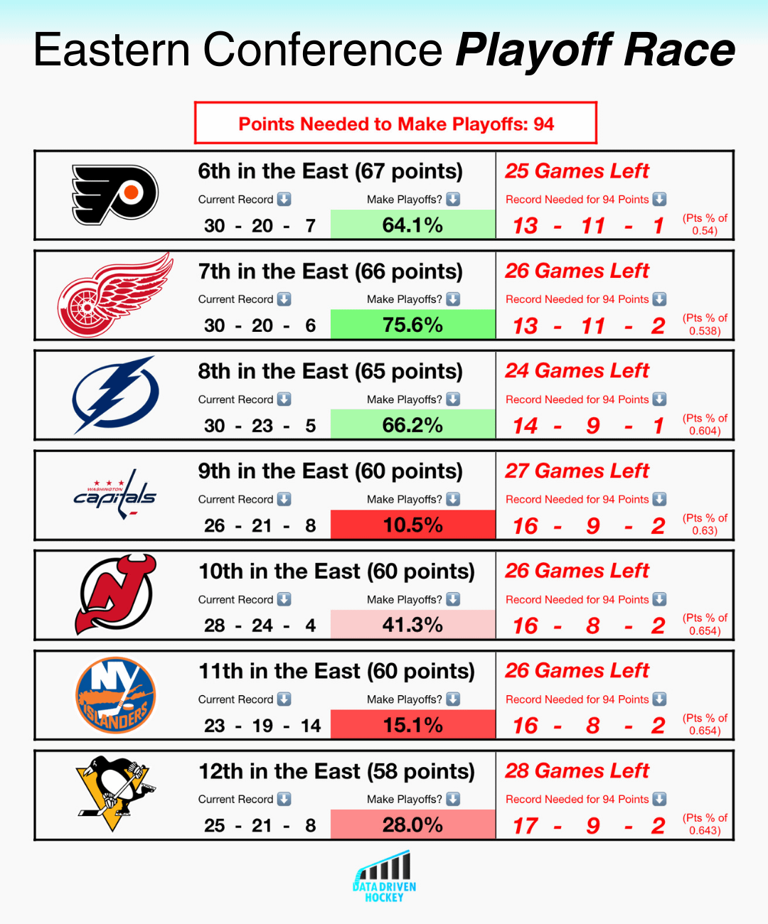 It’s crazy the Caps have a game in hand, are tied with the devils, yet have a 30 percentage point less chance to make it than the Devils. The Math checks out to me I just don’t know how.