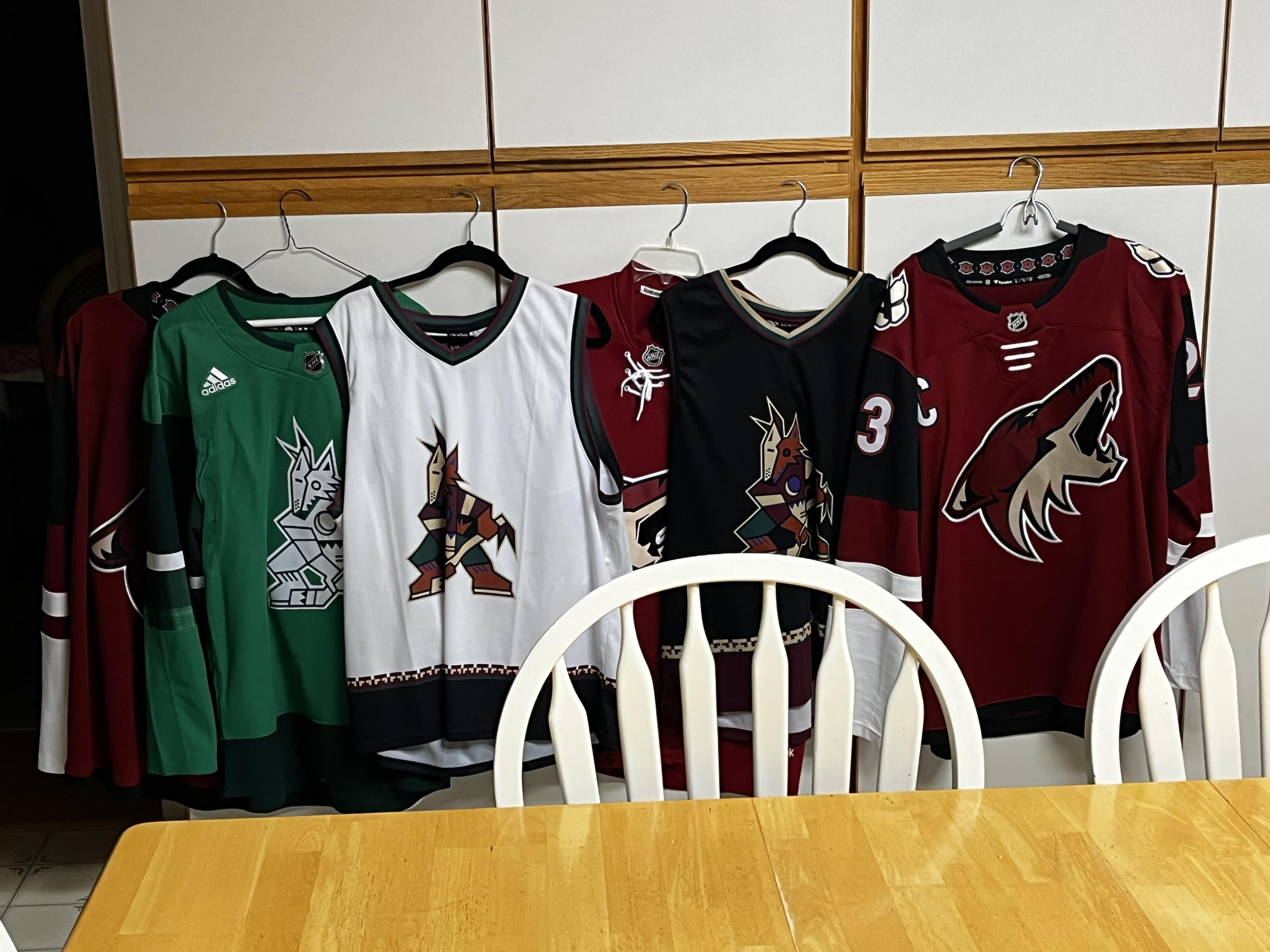 Salut à tous, voici ma collection de maillots/débardeurs de hockey des Coyotes de l’Arizona. Je suis un fan des Coyotes de l’Arizona de Californie, mais j’ai beaucoup d’amis qui vivent en Arizona et j’ai assisté à un match préparatoire des Coyotes en octobre 2021. Malheureusement, je n’ai jamais eu la chance de regarder un match à Mullett. arène. Regarder jouer les Coyotes de l’Arizona me manquera.