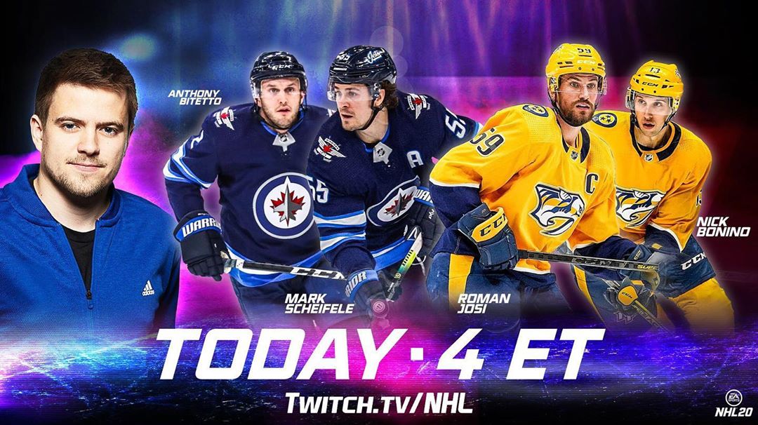 Aujourd'hui à 4p ET @ thenasher61 fait équipe avec Anthony Bitetto (@ abitetto7), Roman Josi (@ rjosi90), Mark Scheifele (@mscheif) et Nick Bonino pour affronter la communauté # NHL20.