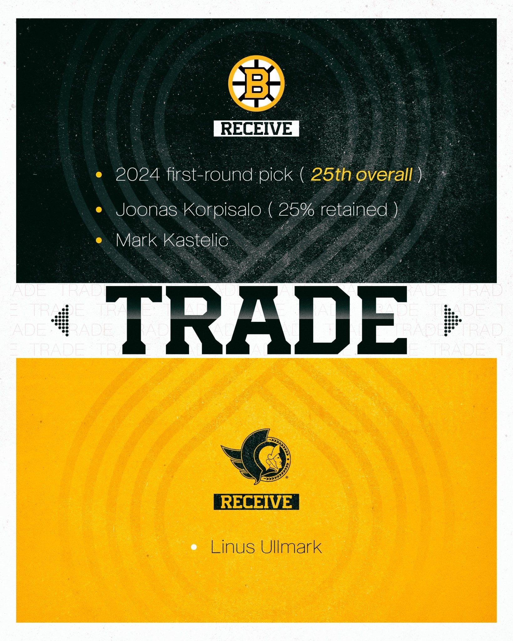 [Bruins] Les Bruins ont acquis l’attaquant Mark Kastelic, le gardien Joonas Korpisalo et un choix de première ronde en 2024 (25e au total) des Sénateurs d’Ottawa en échange du gardien Linus Ullmark.