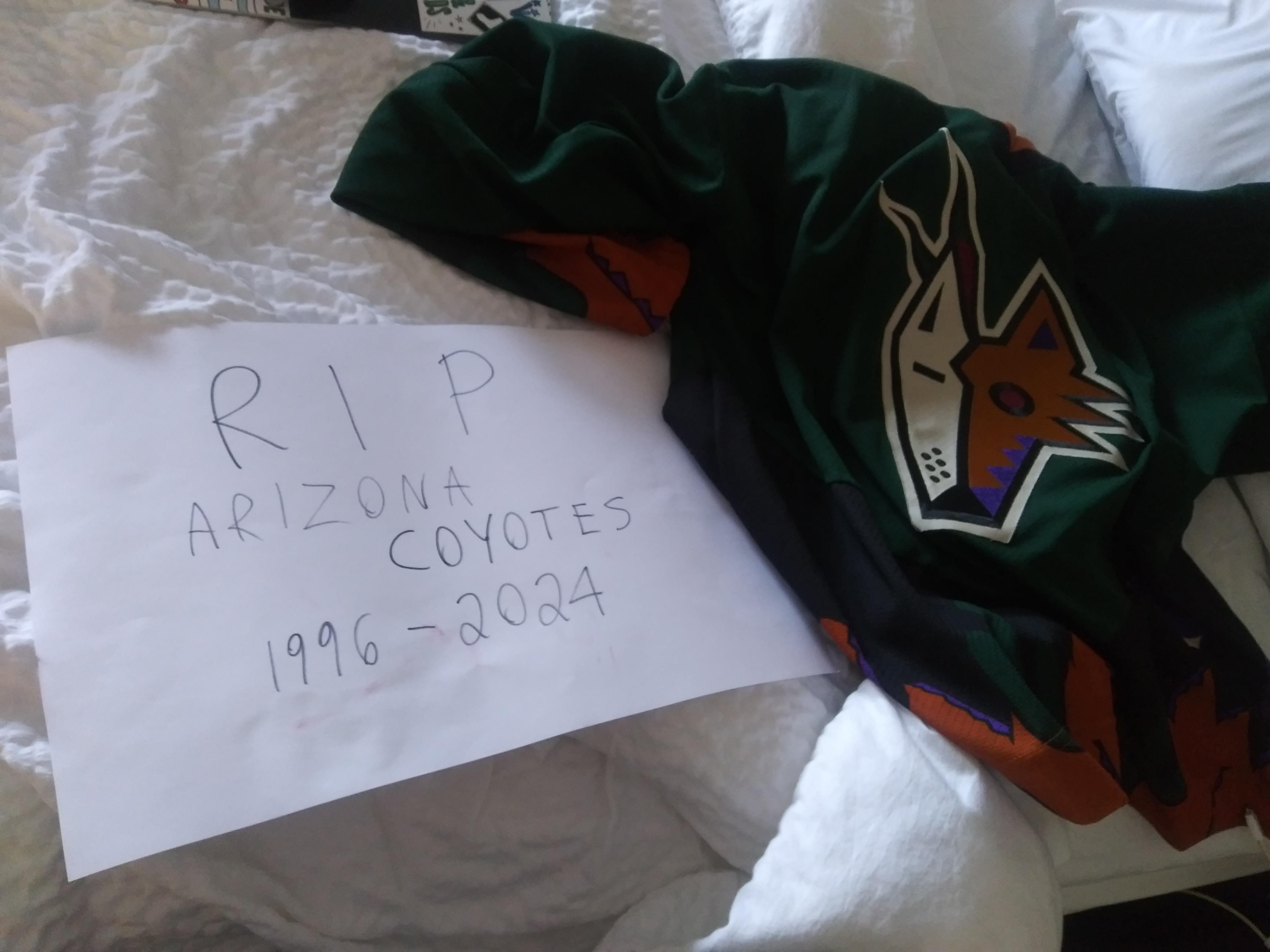 Salut tout le monde. Je suis désolé que cela ait pris du temps, mais je suis allé à la finale de la saison régulière à Chicago et j’ai porté ça. J’ai quelques personnes pour reconnaître les Yotes. J’ai obtenu le maillot lors d’un match des Thrashers en 2004, je l’ai donc gardé pendant un certain temps.