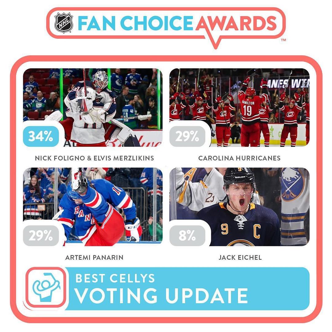 Nick Foligno et Elvis Merzlikins (@merzly) conservent la tête avec des jours restants dans le vote #NHLFanChoice, mais @artemiypanarin et les @Canes se rapprochent! VOTEZ EN BIO ☝️