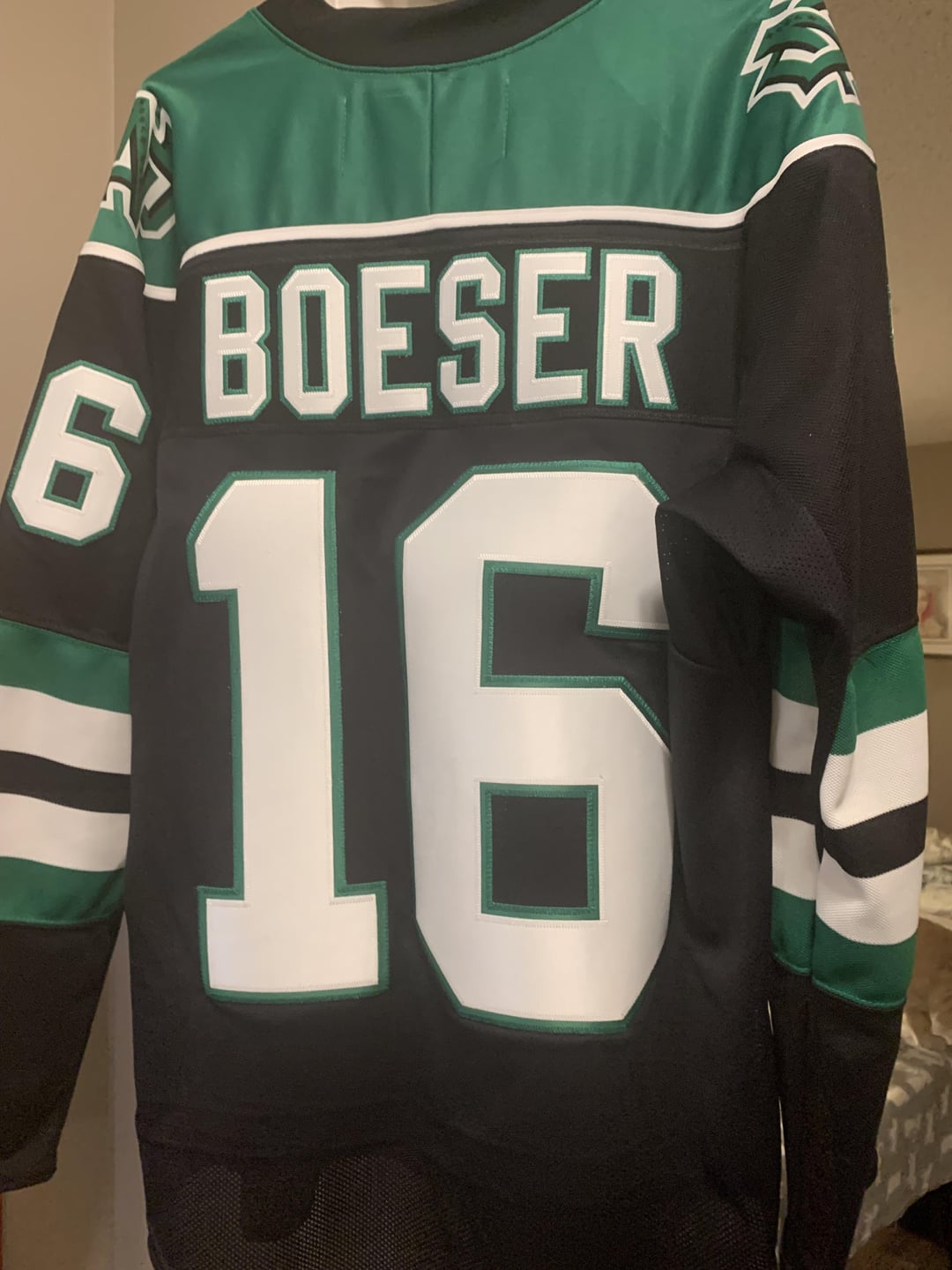 Les maillots universitaires de Boeser sont très rares sur le marché. Je suis content d’avoir pu obtenir un maillot Reebok vierge car il n’a jamais porté d’Adidas en jouant pour l’UND. Le kit avec nom et numéro et le patch NCHC ont été commandés directement à la boutique Sioux. La boutique de hockey de Langley a fait la couture.