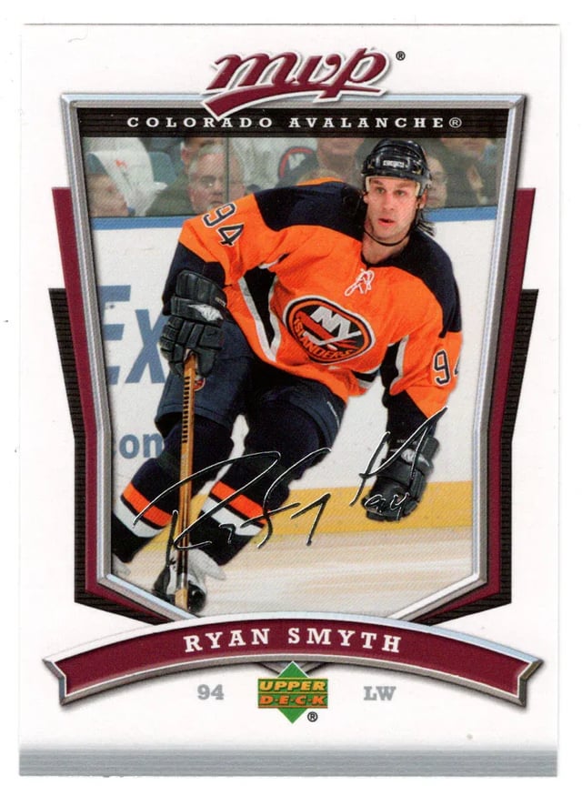 6. That Ryan Smythe card is hilarious. My first thought was the orange looked right because it’s close enough to Edmonton, until you notice the logo. But then the banner says « Colorado Avalanche » and I’m like, make up your mind, Ryan.