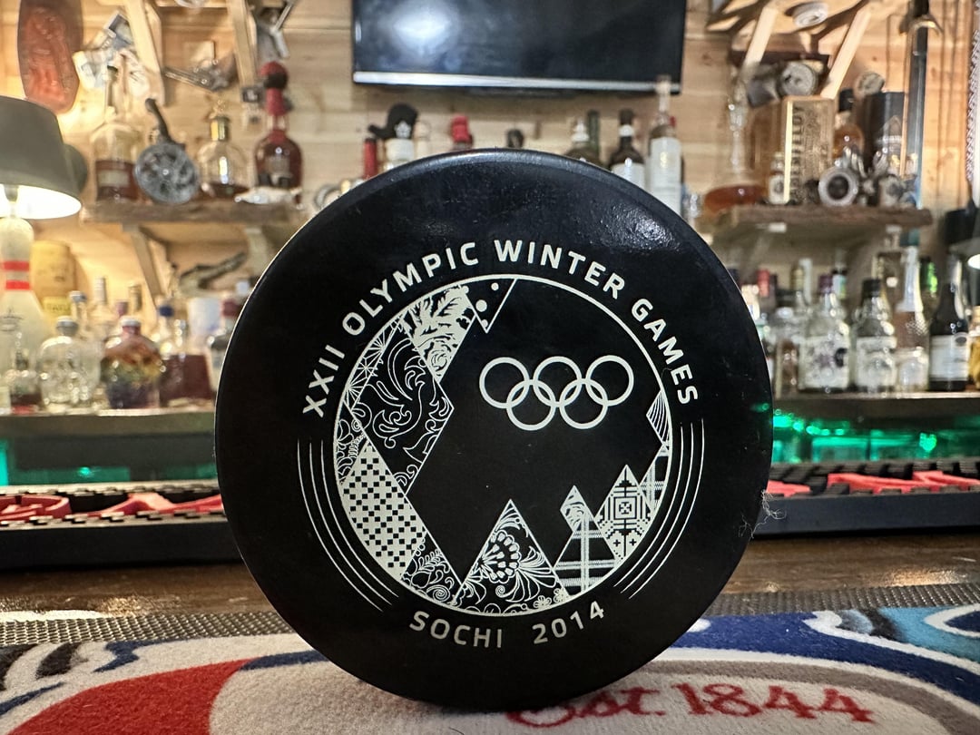Google “game used hockey puck” for Sochi. Check against the results. What wording is on the side of the puck?