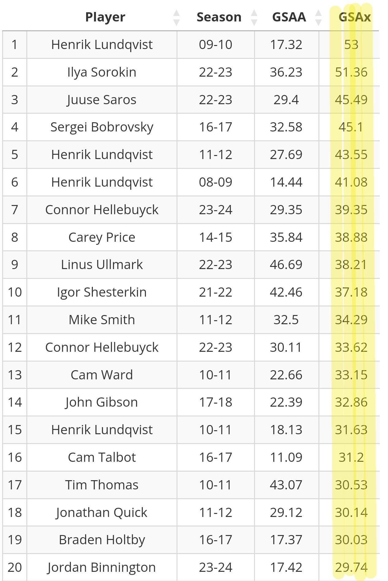 Not taking away from Lundqvists seasons, but his GSAA isnt as high as others. Meaning there were less goals scored those years? That stat makes Ullmark and Shesterkins years that much more impressive