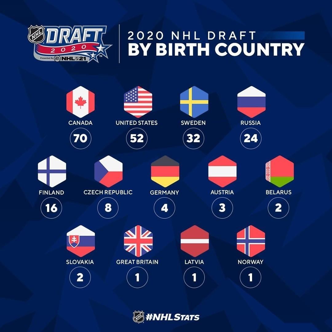 13 pays différents étaient représentés dans le #NHLDraft 2020, dont trois joueurs d’origine autrichienne – le plus grand nombre en une année de repêchage!