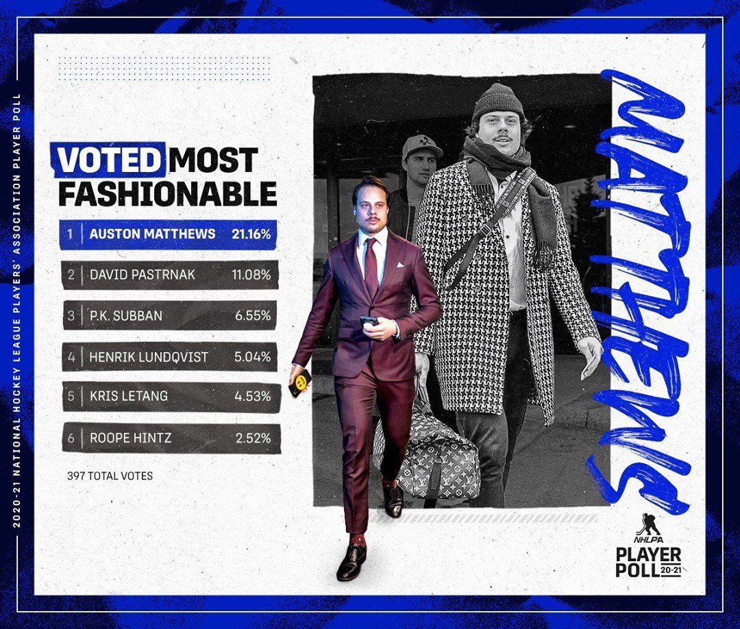 Selon les joueurs, @austonmatthews est le roi du style. 👑 #NHLPAPlayerPoll (via @nhlpa) HockeyHockey sur glaceHockeySurGlaceIce HockeyIceHockeyLA LNHLALNHLigue nationale de hockeyLigueNationaleDeHockeyLNHNational Hockey LeagueNationalHockeyLeagueNHLNHLPAPlayerPoll