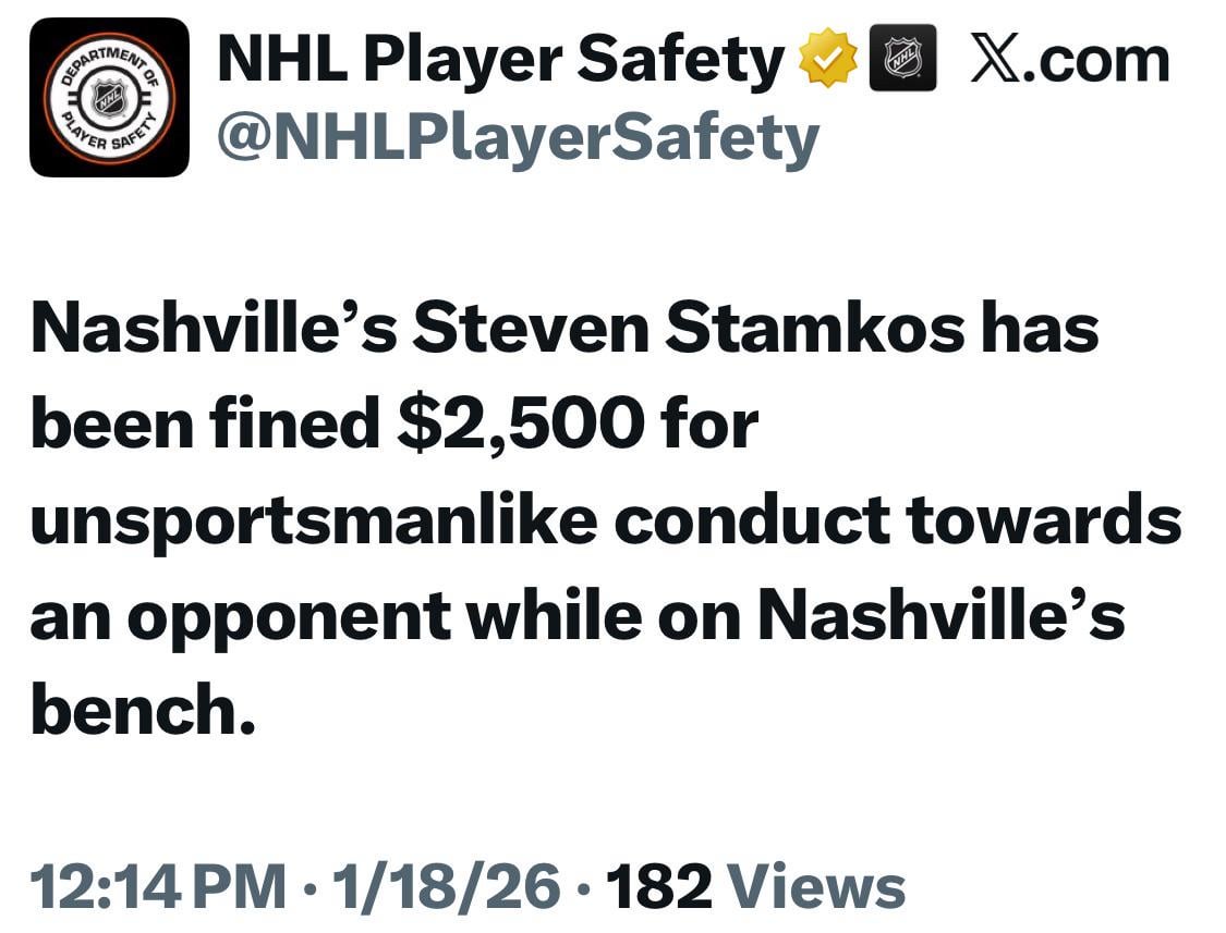 Steven Stamkos fined for hurting a Vegas player’s fee fees.