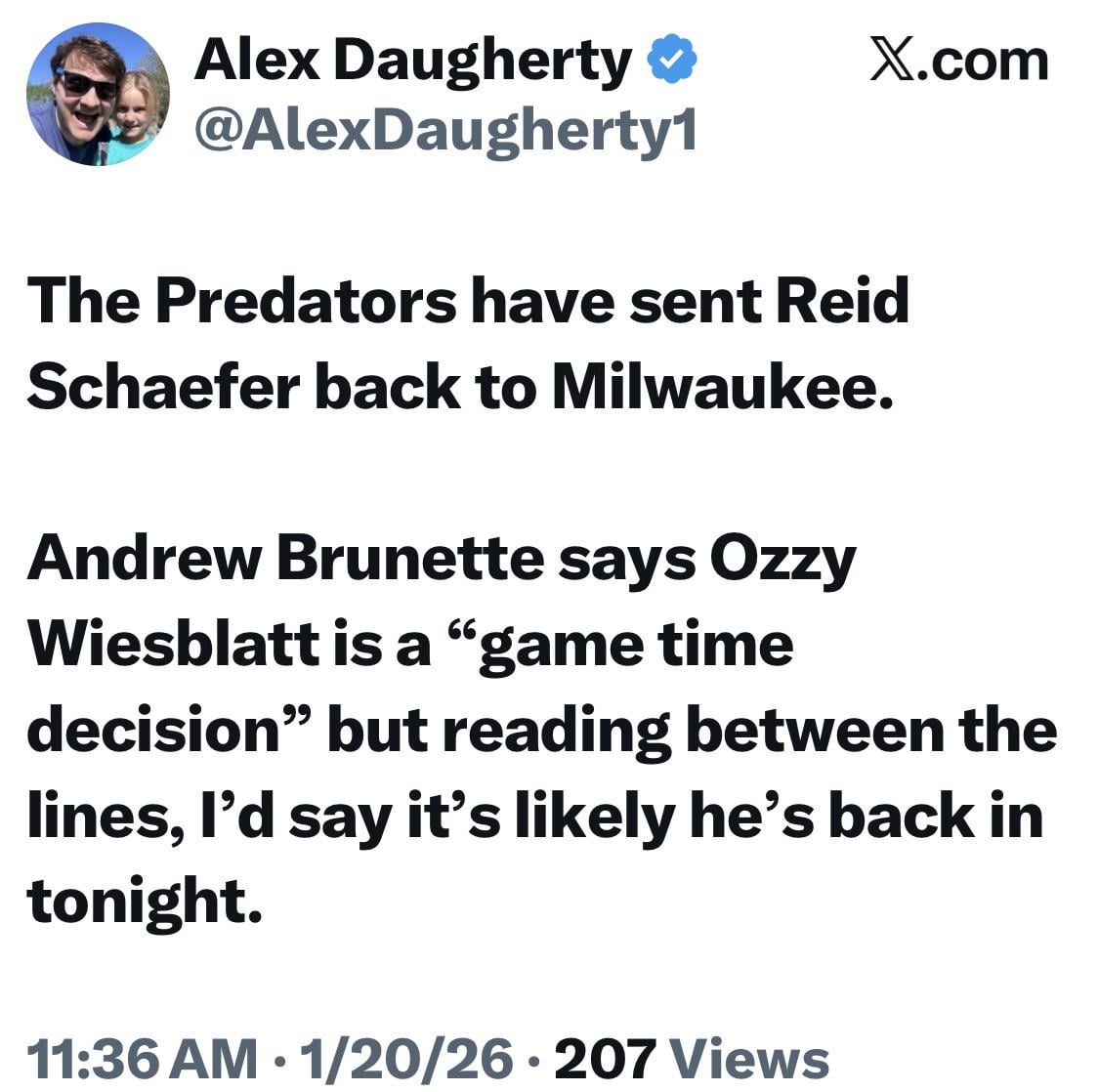 [Daugherty] Les Predators ont renvoyé Reid Schaefer à Milwaukee. Andrew Brunette dit qu’Ozzy Wiesblatt est une « décision de temps de jeu », mais en lisant entre les lignes, je dirais qu’il est probable qu’il soit de retour ce soir.