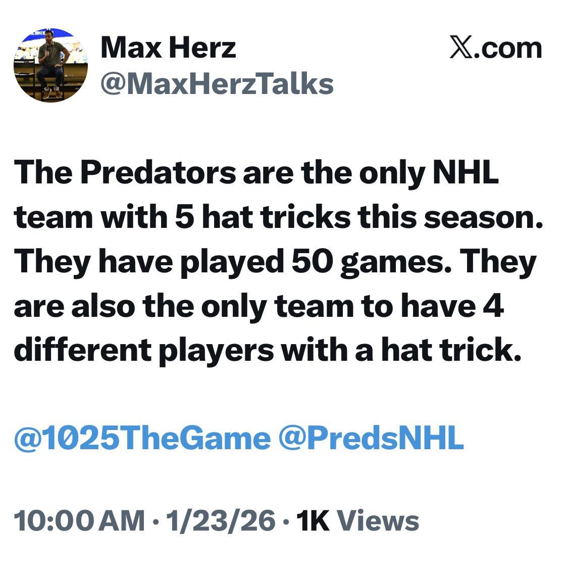 [Herz] Les Predators sont la seule équipe de la LNH à avoir réussi 5 tours du chapeau cette saison. Ils ont joué 50 matchs. C’est aussi la seule équipe à avoir 4 joueurs différents avec un triplé.