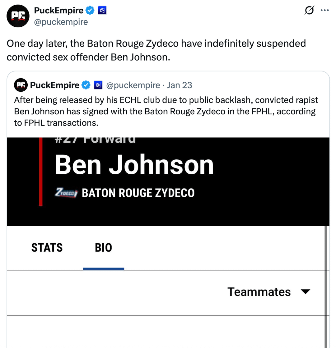 Obviously what he did was horrible and he is a terrible person, it this just makes the FPHL look like a total clown show. They approve the contract and then suspend him without him doing anything during the game.