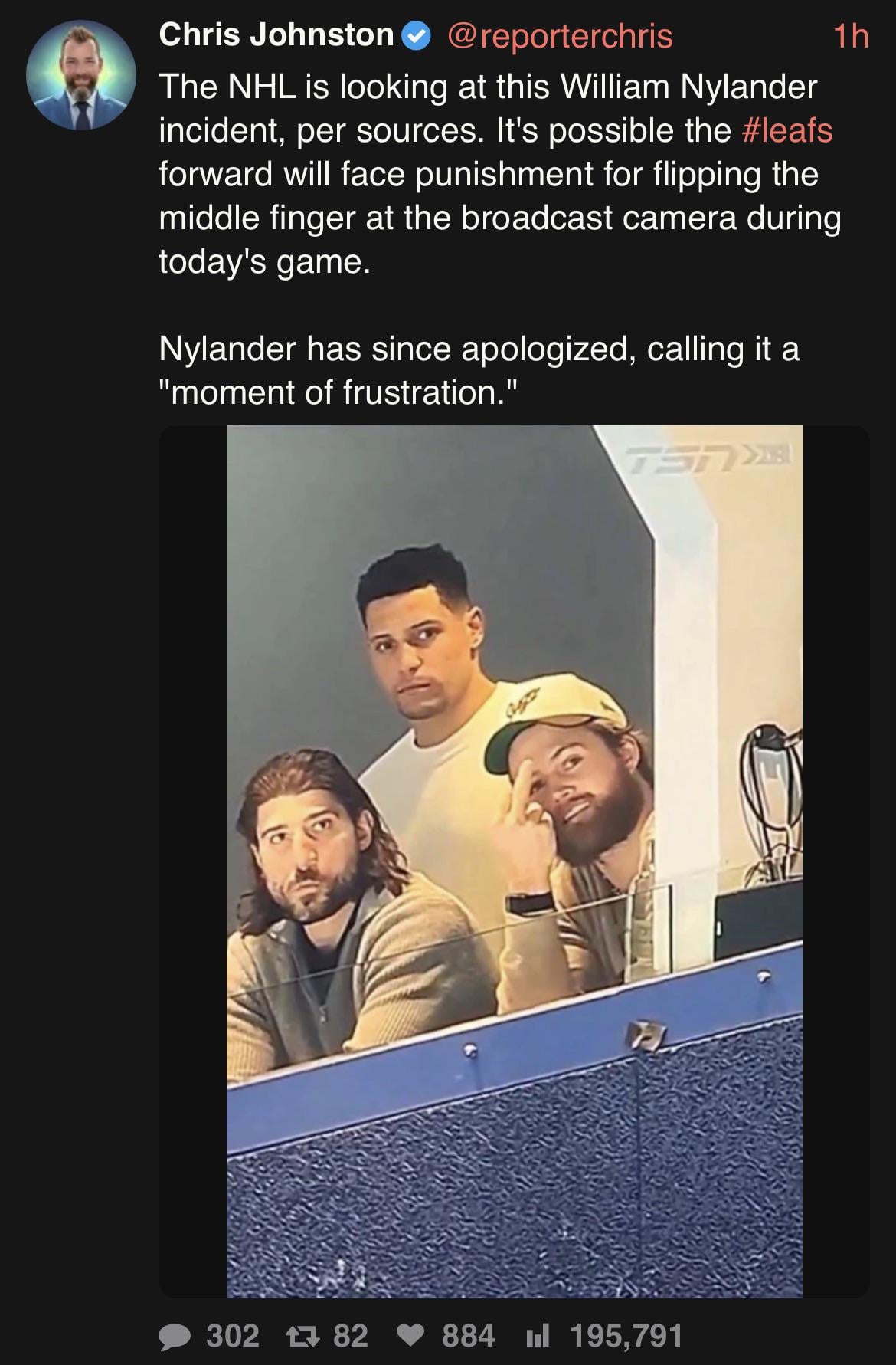 [Johnston] La LNH examine cet incident de William Nylander, selon des sources. Il est possible que les Leafs soient punis pour avoir fait un doigt d’honneur à la caméra de diffusion pendant le match d’aujourd’hui. Nylander s’est depuis excusé, qualifiant cela de « moment de frustration ».