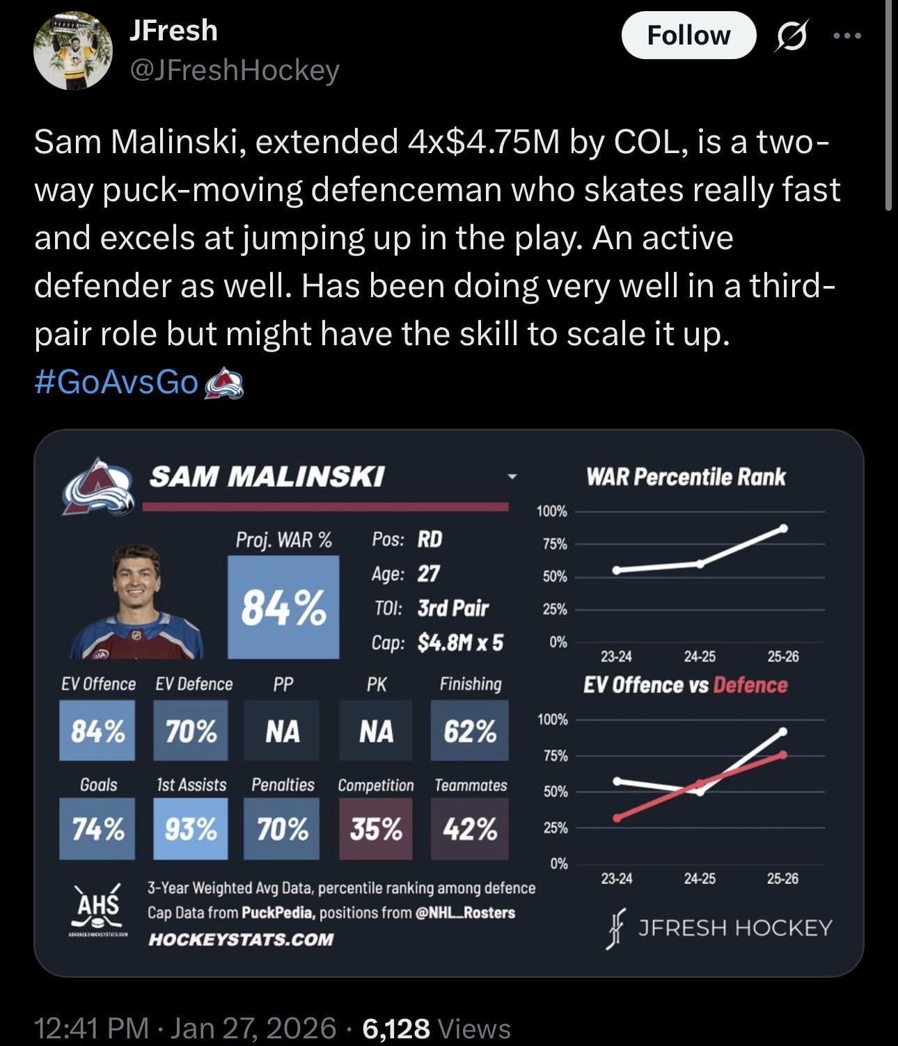 Great signing. He’s been stellar this year, and he’s moved into the top 4 since Toews was injured, including playing on his off side the first pairing with Makar, and he hasn’t skipped a beat. This contract is already good value and will age really well. He’s likely going to be a second pairing staple for the Avs for years