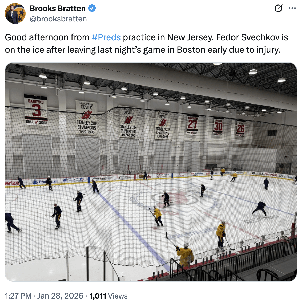 [Bratten] Bonjour depuis l’entraînement des Preds dans le New Jersey. Fedor Svechkov est sur la glace après avoir quitté tôt le match d’hier soir à Boston en raison d’une blessure.