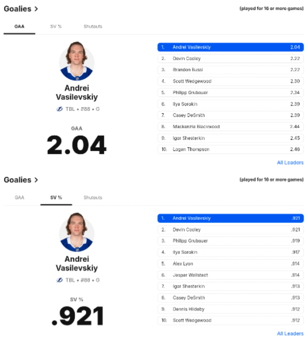 Vasy est désormais n°1 en GAA et pourcentage d’économies — lazysoldier Association de l’EstAtlantic DivisionAtlantique DivisionEastern ConferenceLightning de Tampa BayTampa Bay Lightning 4 Comments Wheresyourlunchmoney 3 mois ago VEZINA WhiskeyGrandma 3 mois ago VASI VASI VASI KILLER_IF 3 mois ago Would have won Vezina last season if Helle didnt have the best goalie season since Price’s 2015. It’s okay, he’ll just win this season tozze_88 3 mois ago I wanna say what Sorokin is doing isn’t sustainable but we’re 50 games in at this point, he probably ends up taking Vezina. That said I would absolutely love to see Vasy get it, he’s been unreal. Write A CommentVous devez vous connecter pour publier un commentaire.