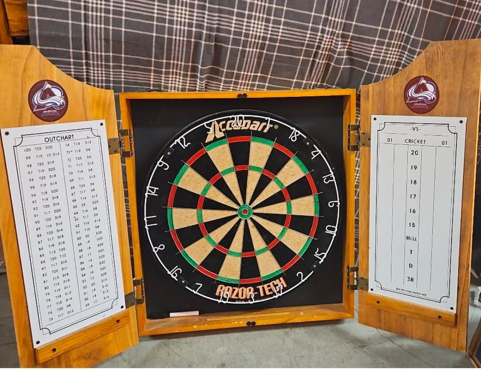 Ensemble d’armoire de jeu de fléchettes Colorado Avalanche (bois massif + planche Accudart) Prix : 60 $ Catégorie : Articles de sport / Jeux / Vêtements de fans État : Utilisé – Bon Description : Ajout parfait à la caverne ou à la salle de jeux de tout fan des Avs. Il faut libérer de l’espace, donc laisser cela aller à moindre coût. Détails : Armoire Avalanche personnalisée : Armoire en bois massif avec le logo Avs sur le devant. Planche de style professionnel : comprend une cible de fléchettes en poils Accudart Razor-Tech (système de fil auto-réparateur et sans agrafes). Tableaux de bord : intégrés "Cricket" et "01" tableaux d’affichage sur les portes. Prêt à accrocher : construction robuste. 60 $ prend toute la configuration. Récupération : région d’Arvada / Lakewood. Paiement : Cash ou CashApp.