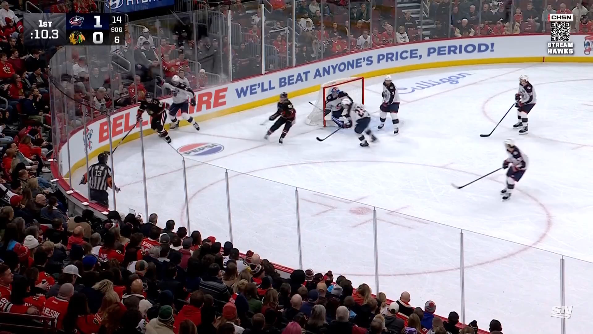 Connor Bedard frappe le rebond du tir d’Alex Vlasic avec 2,7 secondes à jouer en première période pour son 22e but de la saison