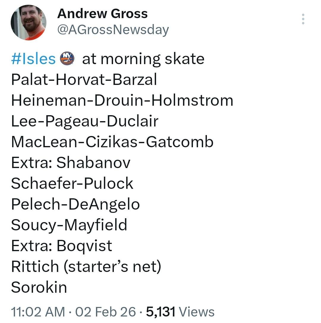 https://xcancel.com/AGrossNewsday/status/2018354372254609683?t=gGlBTni0SVYtZx2u3eOCTw&s=19 — discofrislanders Association de l’EstEastern ConferenceIslanders de New YorkMétropolitaine DivisionMetropolitan DivisionNew York Islanders 5 Comments RichAbbreviations966 3 mois ago Palat gonna go off on the 1st-line Datdude_717 3 mois ago Top Line Palat Top Line Palat apatheticVigilante 3 mois ago What does Roy see in Drouin? Am I missing something? LameBicycle 3 mois ago Ah, Drouin taken off healthy scratch. We are saved IDeaconBluesI 3 mois ago Really like seeing the defensive pairings the same every game Write A CommentVous devez vous connecter pour publier un commentaire.