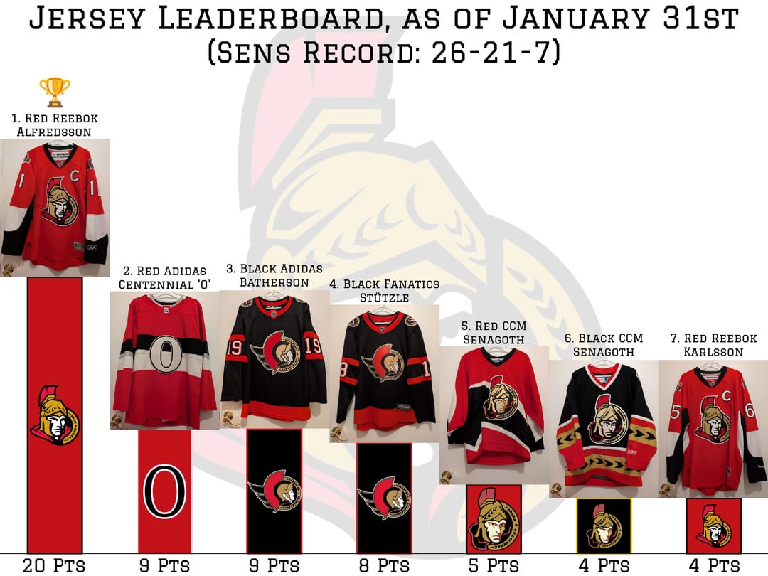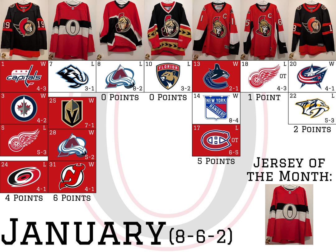Dans l’ensemble, nous avons connu un bon début de mois, un milieu très mou, puis une bonne fin de mois. Le maillot Alfredsson reste presque inaccessible, mais les maillots Centennial « O » et Batherson ont réalisé de bons gains. Le maillot d’Alfredsson tiendra-t-il la victoire et le titre de "maillot le plus chanceux" d’ici la fin de l’année, ou est-ce que l’un des autres prendra le relais ? Faites vos paris !