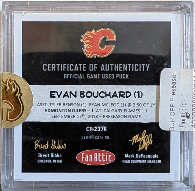 Je suis ravi de décrocher celui-ci : rondelle de but utilisée lors du premier match d’Evan Bouchard dans la LNH et but du premier match de pré-saison 2018 le 17 septembre 2018. C’est la première fois que Bouchard a porté le maillot des Oilers de la LNH et a marqué son tout premier but avec cette rondelle !