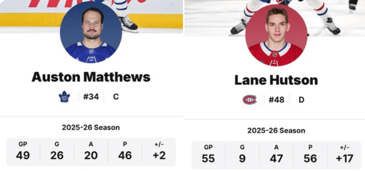 Lane Hutson has 10 more pts than Austin Matthews, fixed it for you for relevant stats