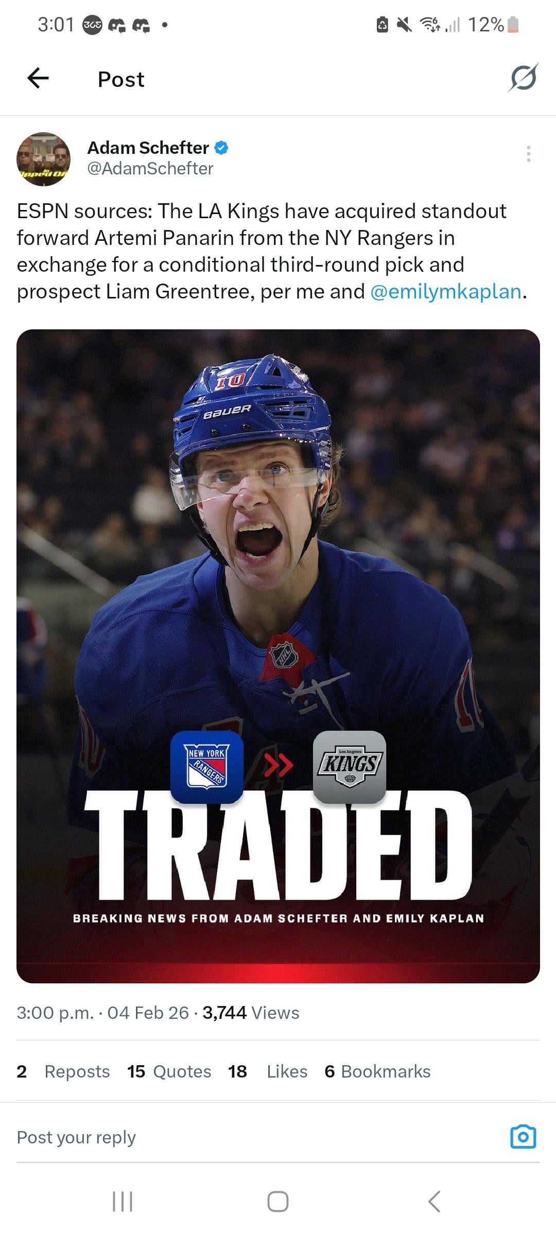 [Schefter] Sources ESPN : Les Kings de Los Angeles ont acquis l’attaquant exceptionnel Artemi Panarin des Rangers de New York en échange d’un choix conditionnel de troisième ronde et de l’espoir Liam Greentree