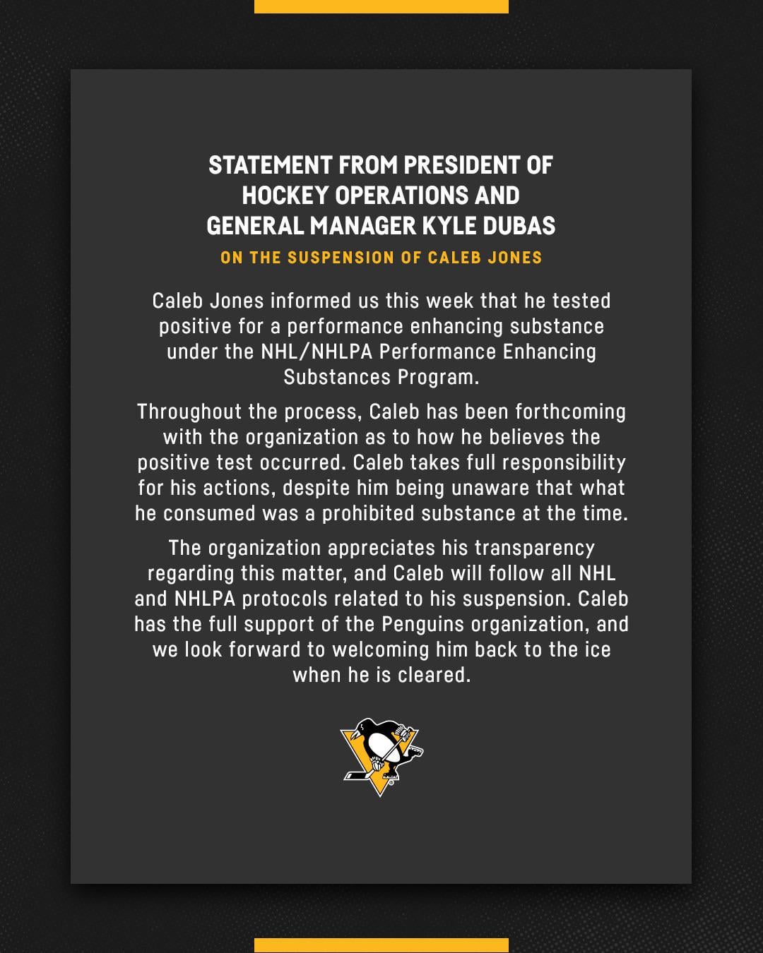 [Penguins] Déclaration du président des opérations hockey et directeur général Kyle Dubas concernant la suspension de Caleb Jones