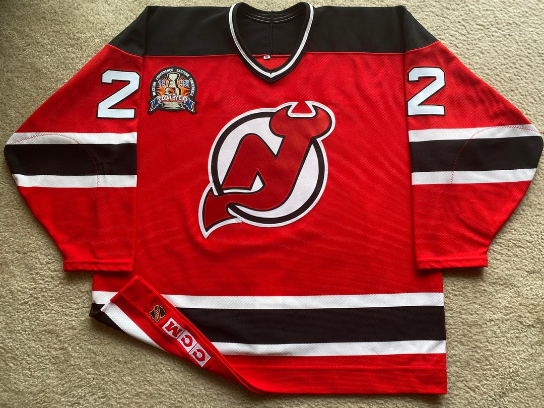 Claude Lemieux Gros bloc airknit avec patch ’95 SCF. Sz 54. Il s’agit d’un nom d’équipe dépouillé au dos supprimé avec un marquage personnalisé. Le kit est fabriqué par EPS. VENDU.