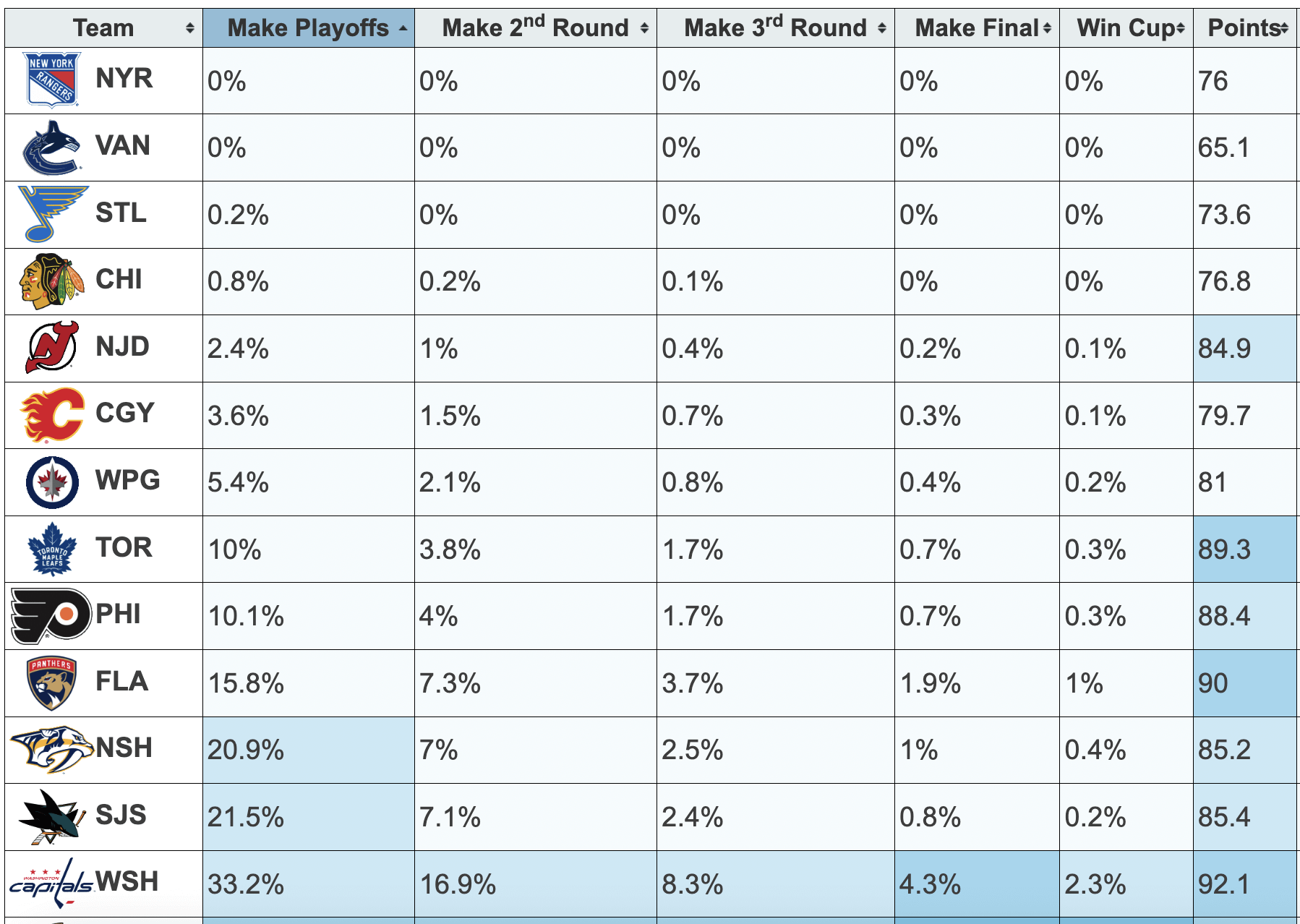 Probably generous too. We’re 8 points back for both the last Wild Card and 3rd in the Metro, and the teams ahead of us keep getting points.