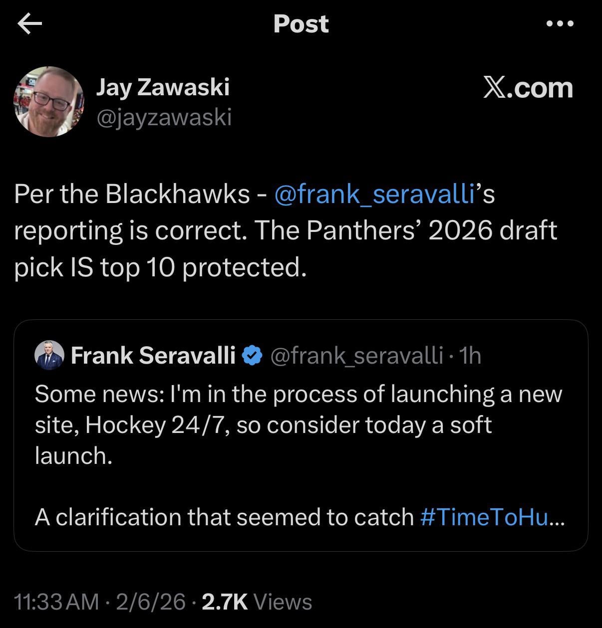 [Jay Zawaski] Selon les Blackhawks, les rapports de Frank Seravalli sont corrects. Le choix des Panthers au repêchage 2026 EST le top 10 protégé.