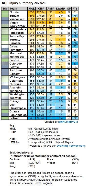 Pietrangelo is included in this because he can technically return next season. But if you take him out our total man games lost becomes 225 (4th to 8th), cap hit by injured players $13.4m (2nd to 2nd) average minutes of injured players 86 (1st to 3rd), and I don’t know lost WAR but I’ll say it falls by 2 to 1.6 (3rd to 19th)