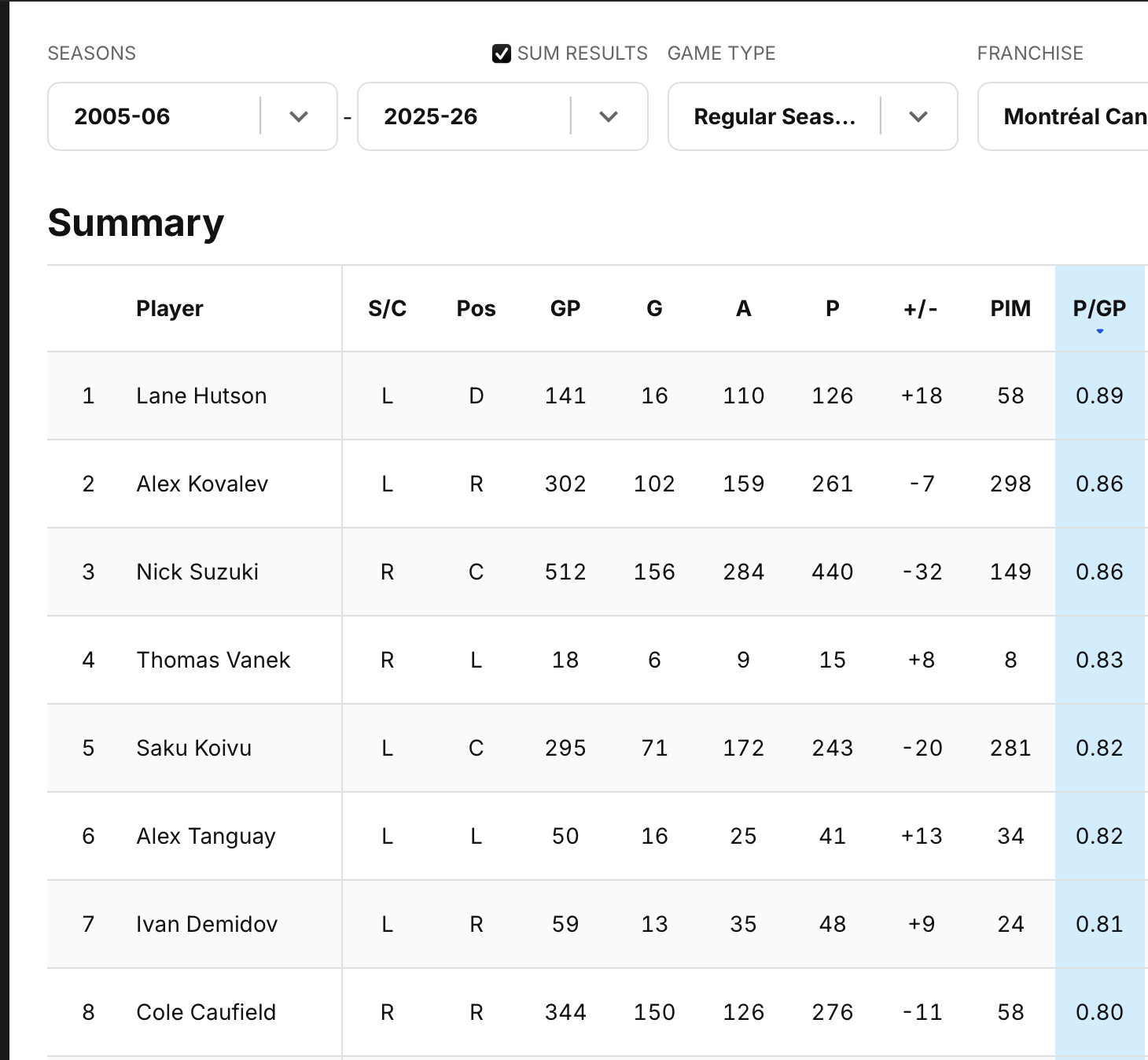 Hutson est n°1 en termes de points par match à l’ère des plafonds. Suzuki #2 à égalité avec Kovalev. Il s’agit peut-être de la meilleure équipe du Tricolore depuis 1993.