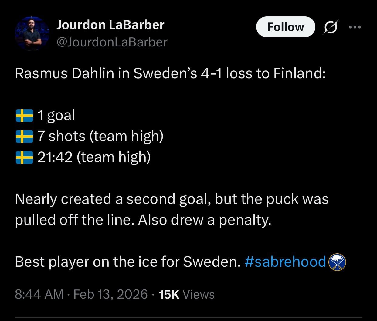 [ Jourdon LaBarber] Rasmus Dahlin lors de la défaite 4-1 de la Suède contre la Finlande : 1 but, 7 tirs (plus haut de l’équipe), 21 :42 (plus haut de l’équipe). Il a failli créer un deuxième but, mais la rondelle a été retirée de la ligne. A également tiré une pénalité. Meilleur joueur sur la glace pour la Suède