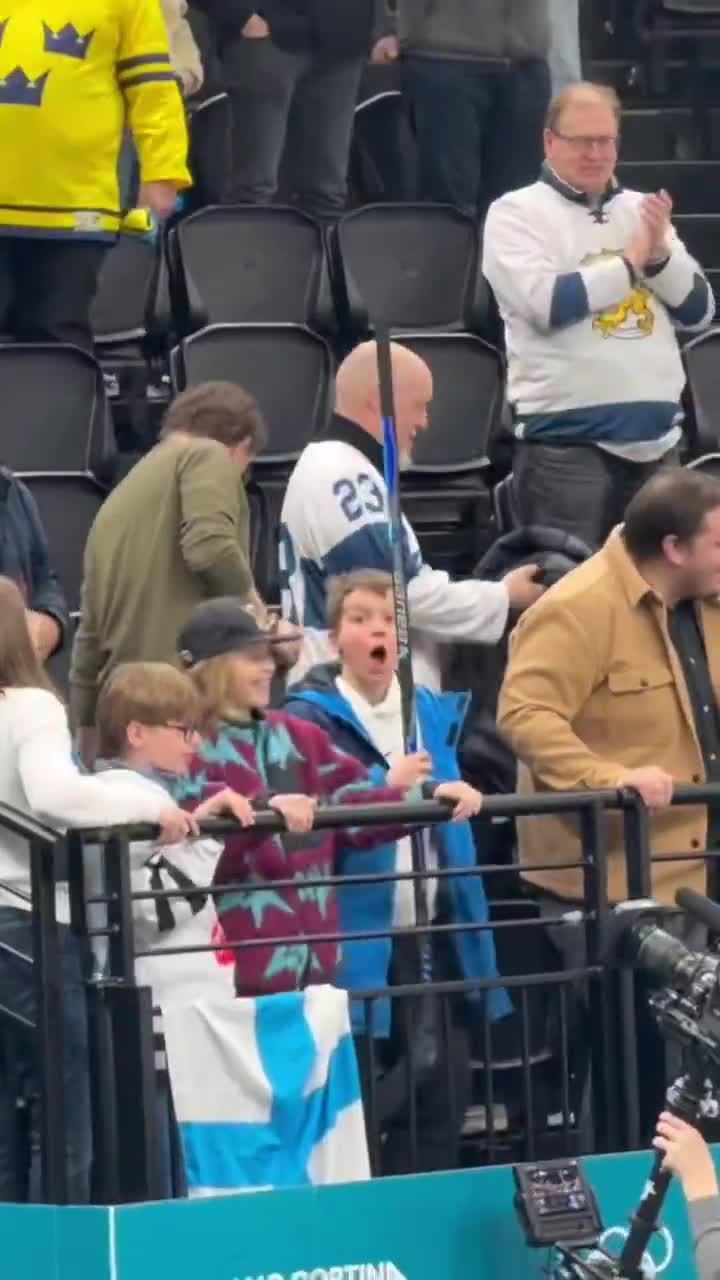 Rantanen donne son bâton à l’enfant après le match. Il se rend compte qu’il ne peut pas faire ça. Il revient tout de suite et donne ses gants à l’enfant.