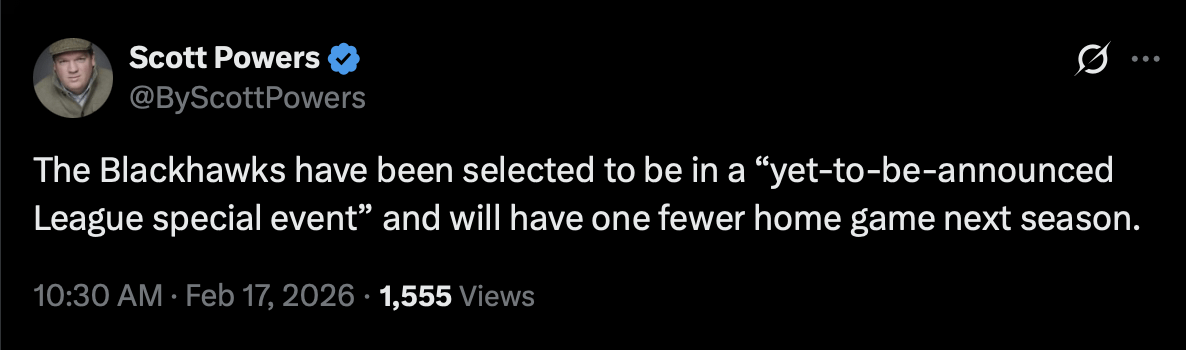 [ByScottPowers] « Les Blackhawks ont été sélectionnés pour participer à un « événement spécial de la Ligue qui n’a pas encore été annoncé » et disputeront un match à domicile de moins la saison prochaine. »