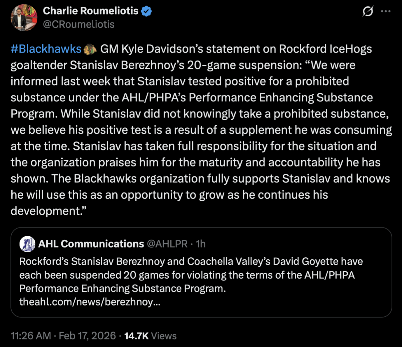 [CRoumeliotis] « Déclaration de Kyle Davidson sur la suspension de 20 matchs du gardien des IceHogs de Rockford, Stanislav Berezhnoy : « Nous avons été informés la semaine dernière que Stanislav avait été testé positif à une substance interdite dans le cadre du programme de substances améliorant la performance de l’AHL/PHPA. Même si Stanislav ne l’a pas fait en connaissance de cause…