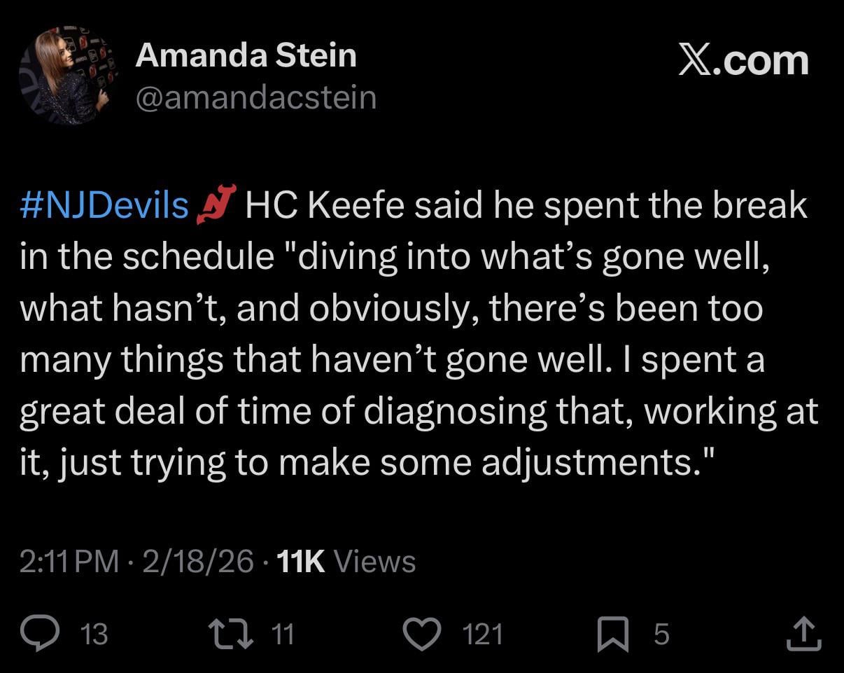 [Stein] #NJDevils HC Keefe a déclaré qu’il avait passé la pause dans le calendrier « à plonger dans ce qui s’est bien passé, ce qui ne s’est pas bien passé, et évidemment, il y a eu trop de choses qui ne se sont pas bien passées. J’ai passé beaucoup de temps à diagnostiquer cela, à y travailler, juste à essayer de faire quelques ajustements. »